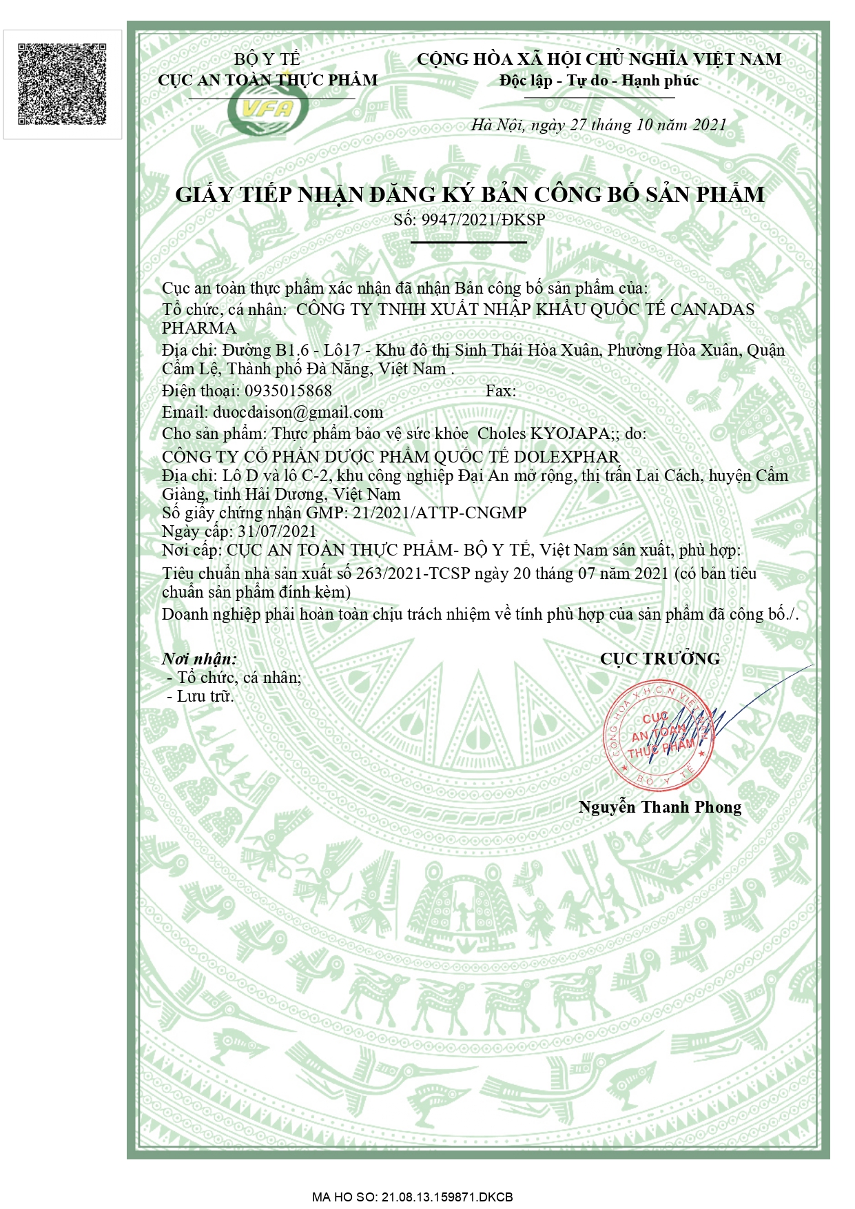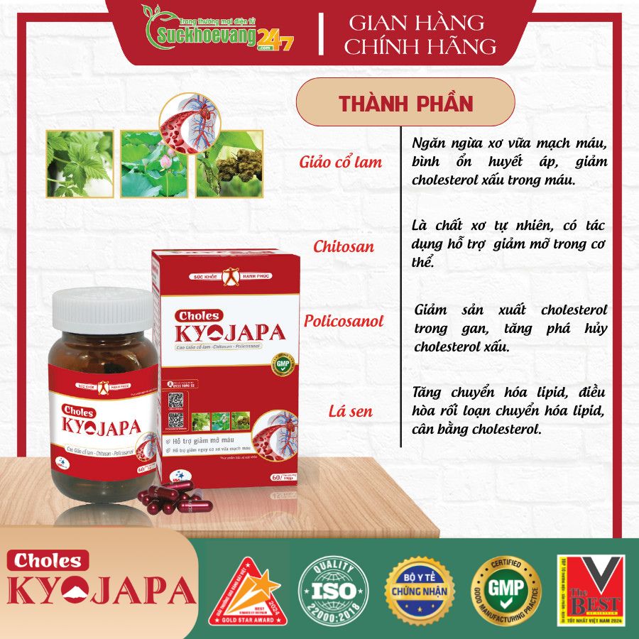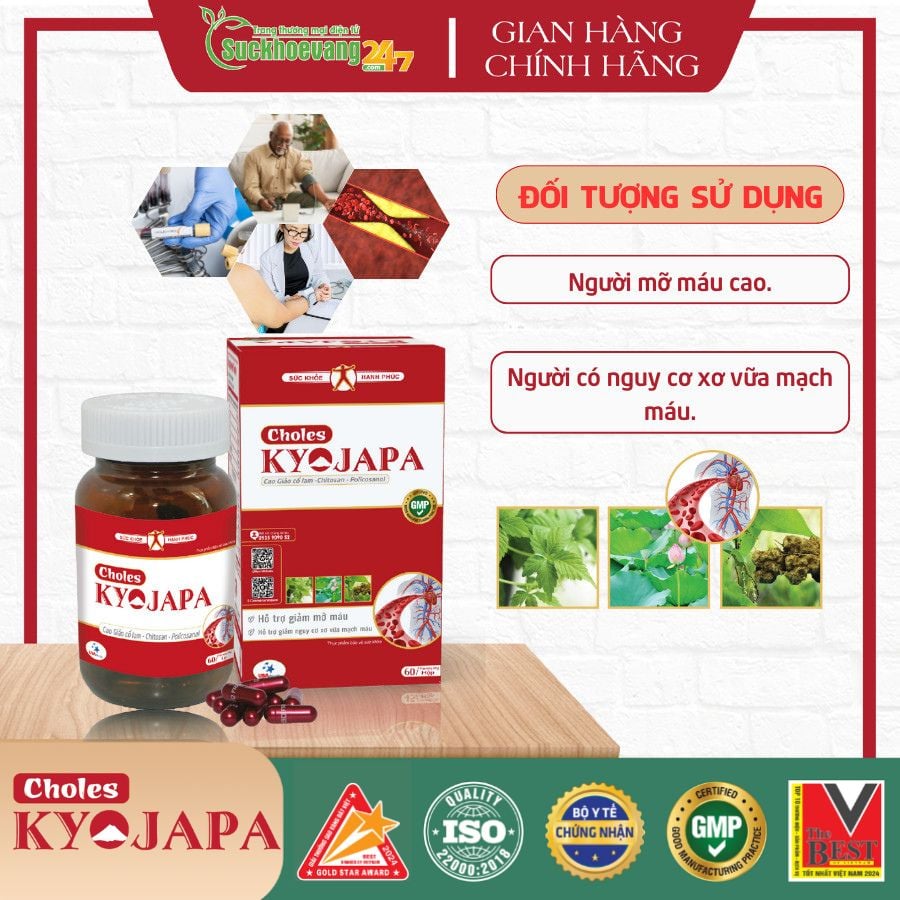 - Choles Kyojapa dành cho người mỡ máu cao, xơ vữa mạch máu. Kết hợp thành phần cao chiết các loại dược liệu quý và hoạt chất như Giảo cổ lam, Nần vàng, Lá sen, Chitosan, Policosanol… có tác dụng giảm lượng cholesterol xấu trong cơ thể, tăng chuyển hóa lipid , giảm mỡ máu, ổn định huyết áp.