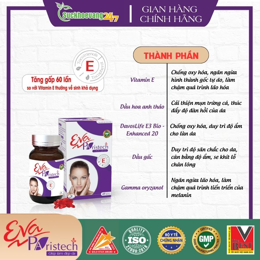 Eva Paristech được điều chế từ các thành phần chính như Vitamin E, dầu hoa anh thảo, DavosLife E3 Bio - Enhanced 20, dầu gấc, Gamma oryzanol... Sự kết hợp của các thành phần giúp sản phẩm sinh khả dụng so với Vitamin E , giúp các hoạt chất phát huy tối đa hiệu quả, công dụng