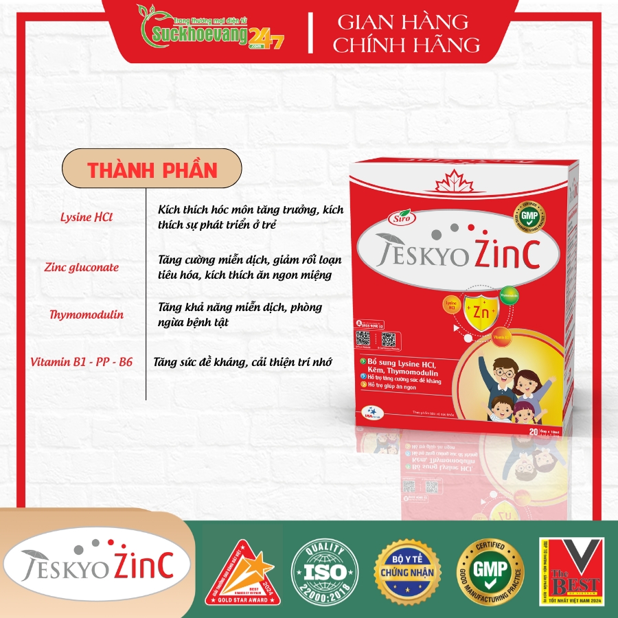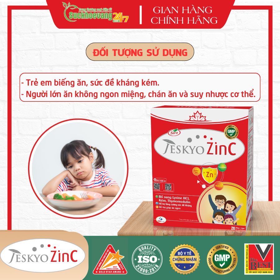 Jeskyo ZinC là sản phẩm có chứa các thành phần như Zinc gluconate, Thymomodulin, Immunecanmix, Magie gluconate, Lysine HCl, và các nhóm vitamin B, P giúp hỗ trợ tăng sức đè kháng cho trẻ, giúp trẻ ăn ngon hơn.