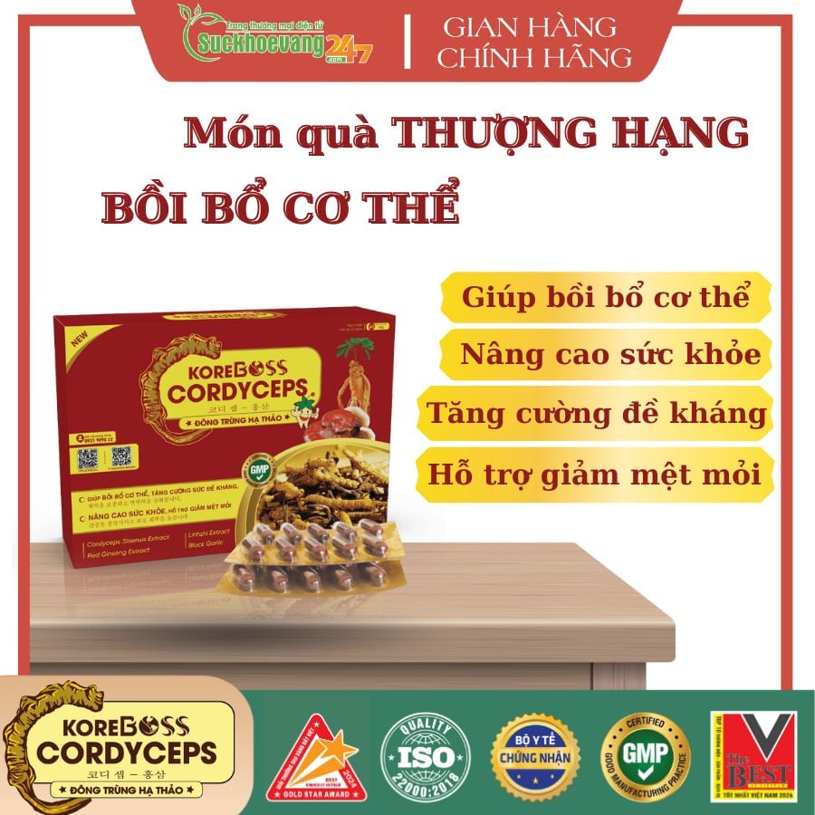KOREBOSS CORDYCEPS là sản phẩm có chứa các thành phần như Chiết xuất Đông trùng hạ thảo (Cordyceps sinensis extract), Chiết xuất Hồng sâm (Red Ginseng extract), L-Lysine HCl, Tỏi đen (Black garlic), Chiết xuất Nấm linh chi (Linhzhi extract),...Giúp bồi bổ cơ thể, tăng cường sức đề kháng, nâng cao sức khỏe, hỗ trợ giảm mệt mỏi.