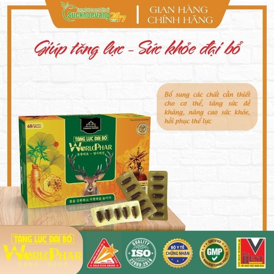 Tăng Lực đại bổ Worldphar là sản phẩm có chứa các thành phần như Cao nhân sâm (Panax ginseng), Cao tỏi đen (Black garlic), Ginkgo biloba extract, Cao nhung hươu, Bột đông trùng hạ thảo, Cao linh chi, Royal jelly (Sữa ong chúa), Omega 3 (EPA, DHA),... có tác dụng bổ sung các chất cần thiết cho cơ thể, tăng sức đề kháng, nâng cao sức khỏe, hồi phục thể lực